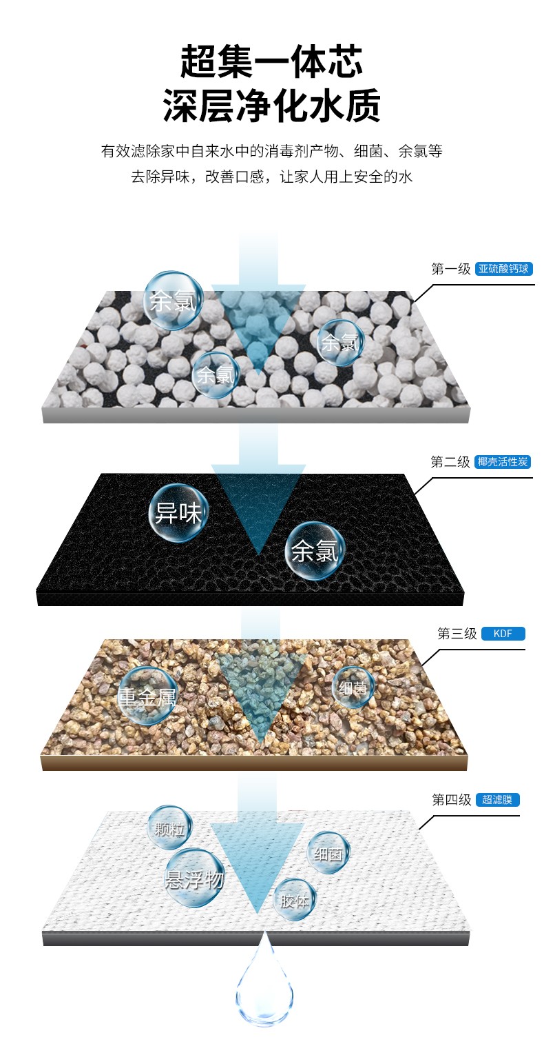 ·采用亞硫酸鈣、KDF、活性炭、超濾四級(jí)過濾,有效去除水中細(xì)菌、余氯有害物質(zhì),去除異味,保證健康飲水